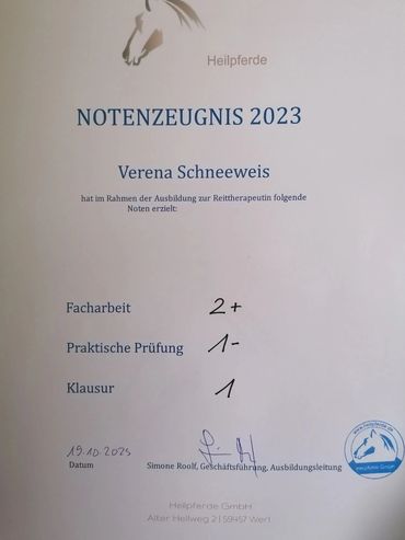 Im Jahr 2023 absolvierte ich meine Prüfung zur zertifizierten Reittherapeutin, um meine Begabung ganz in den Dienst der Menschen mit meinen Pferden stellen zu können.